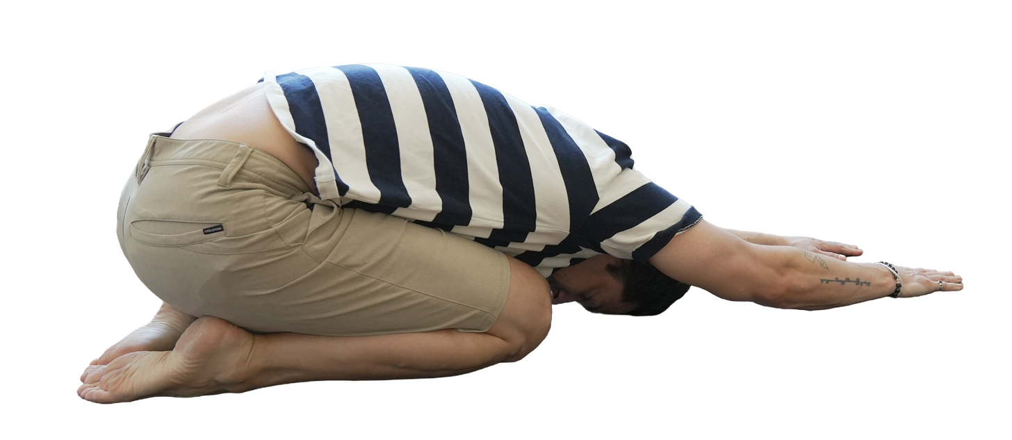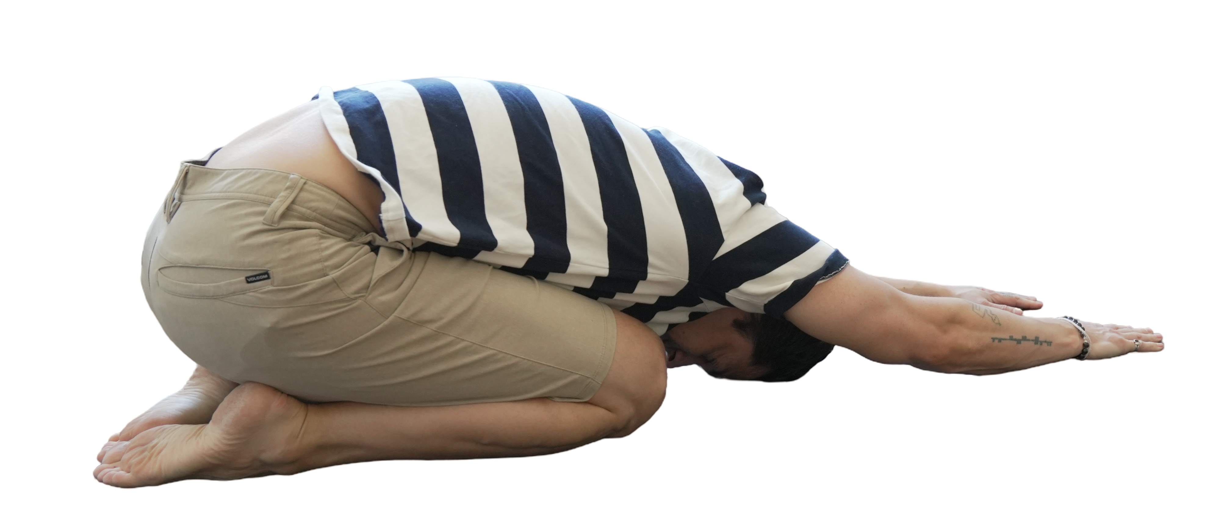 Legs extended or wrapped around your side. I like doing arms extended. Knees on the floor, sit back on your heels, fold forward. This one is less about stretching and more about settling. The nervous system likes it. The lower back likes it. I feel it in my lats and upper back. Come here between the more active poses.