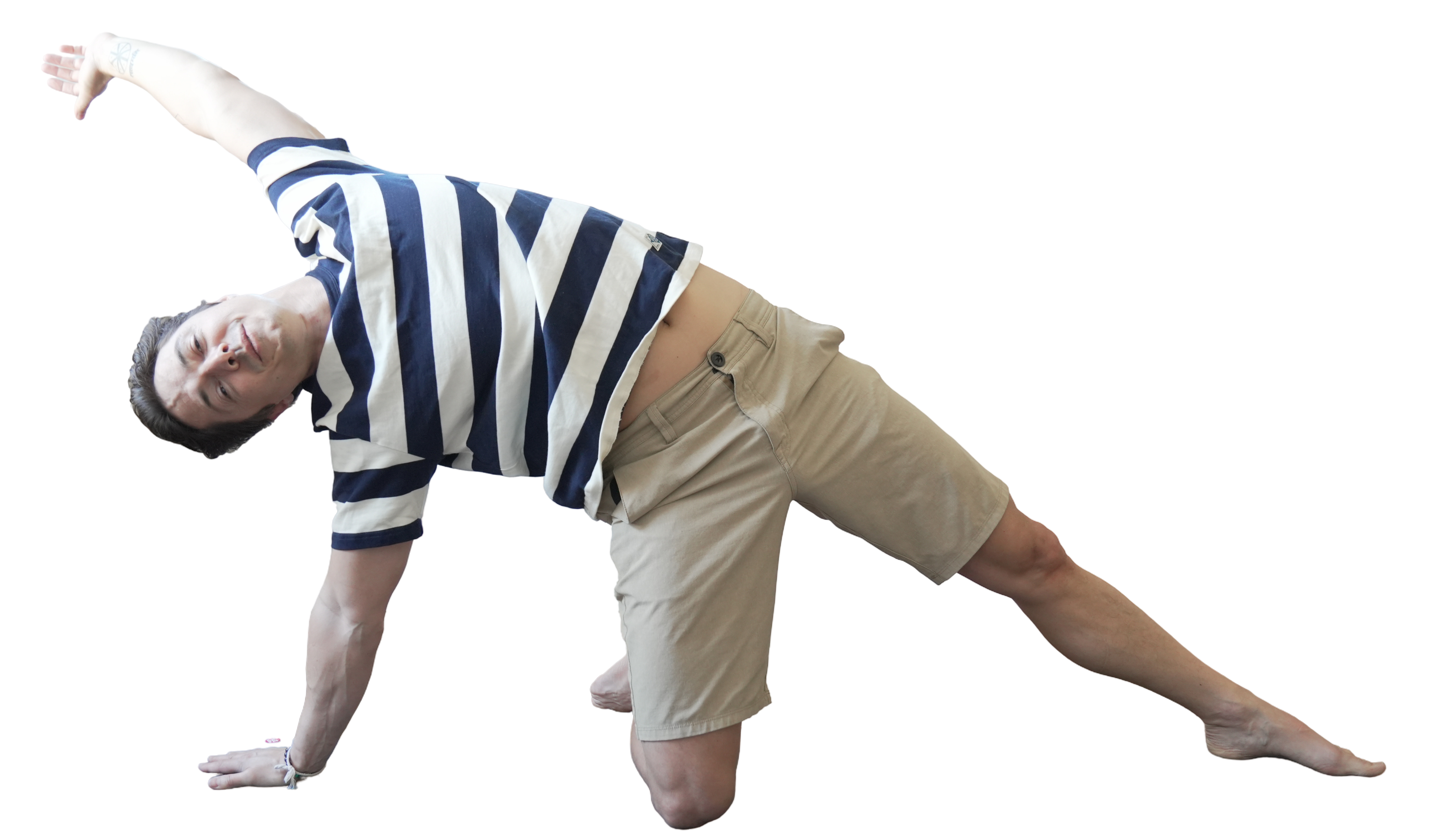 Right knee down, left leg extended straight out to the side. Lean to the right and plant your right hand on the mat beside your knee. Extend your left arm up and over — reaching long, following the line of the extended leg. You should feel it open the entire left side of the body in one continuous stretch: outer hip, obliques, side ribs, all the way through the lat and into the fingertips. Hold, breathe into the long side, then switch.
