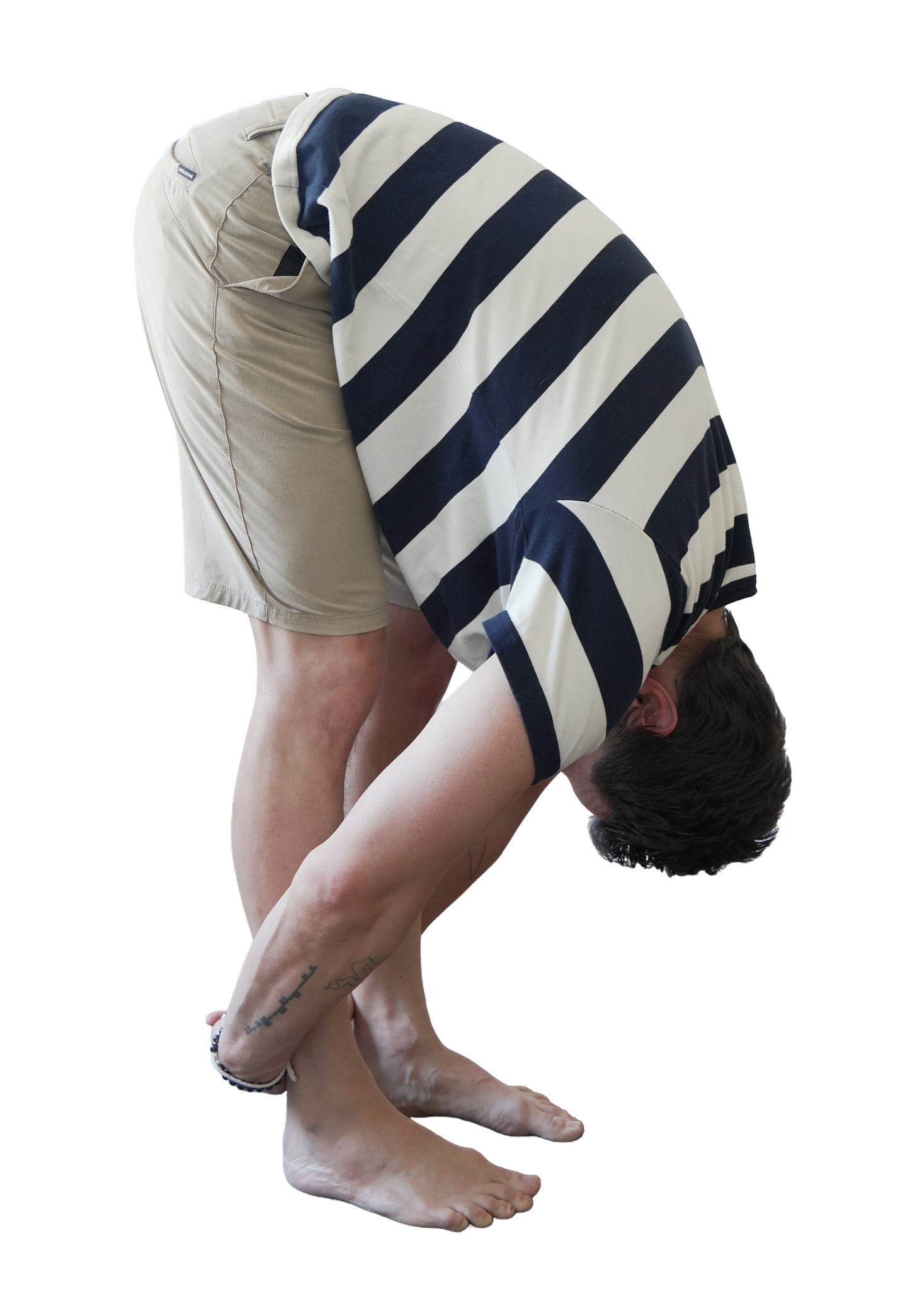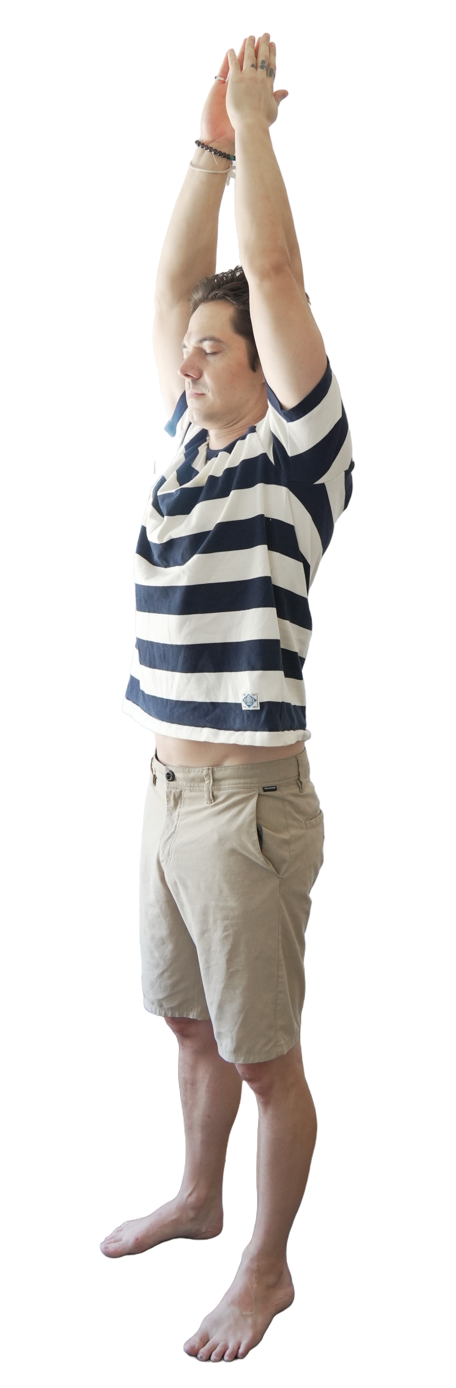 Standing, fold at the hips and let your head hang. Then come all the way up, reach overhead, hands steepled or in prayer, and stretch side to side. Up, down, forward, side, side. The whole vertical axis of the spine needs to move through its range. Desk work keeps it locked in one narrow band.
