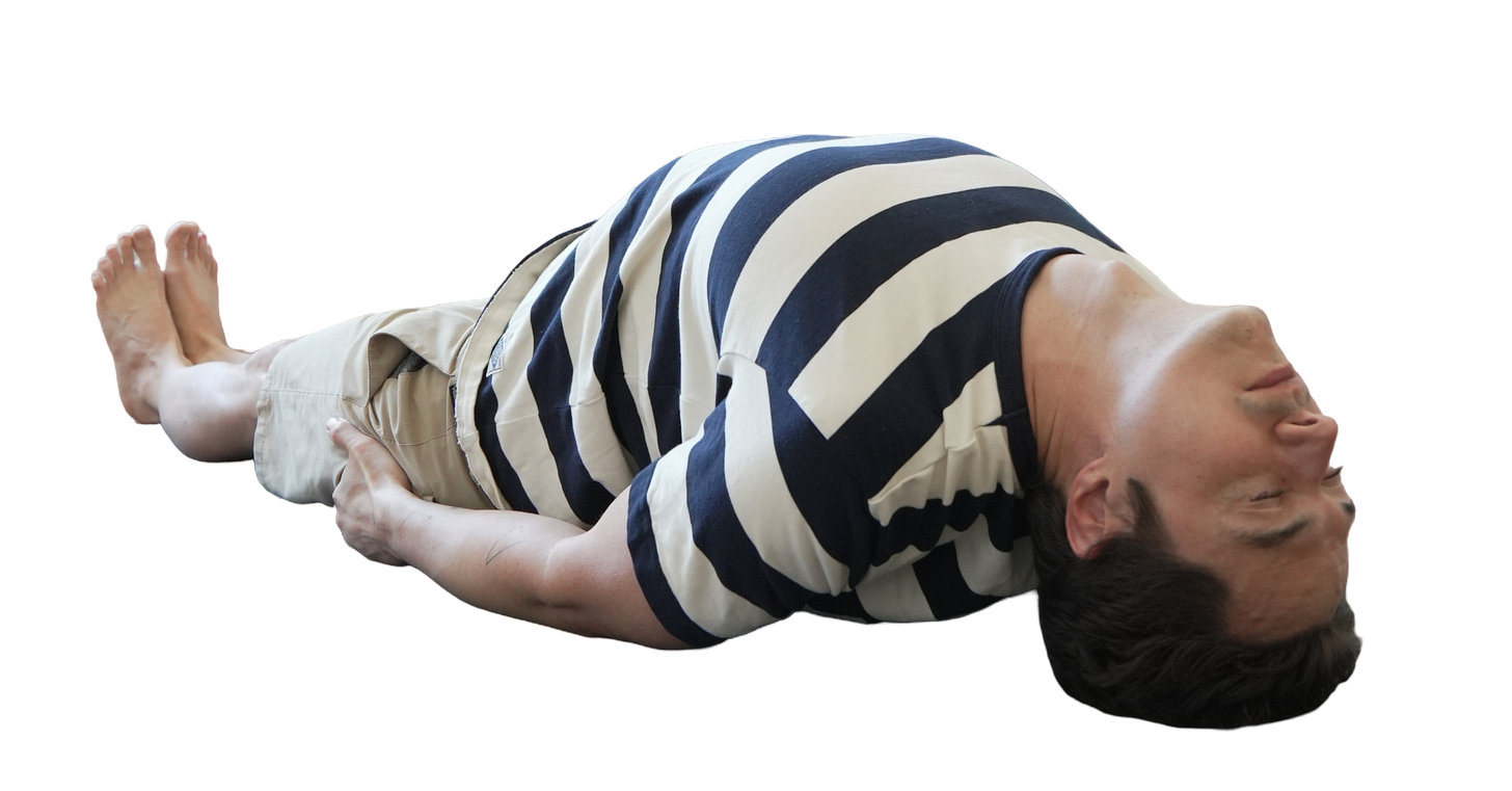 Lay on your back and arch your chest upward, crown of the head touching the floor. Grip the underside of your leg bone so you aren’t putting any body weight on your head or stressing the cervical spine.